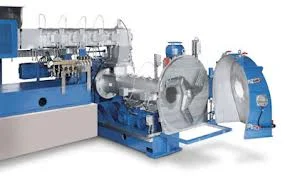 - Proses ekstrusi, merupakan tahap pelelehan material PVC sehingga material yang tadinya berupa bubuk menjadi lumat. Pada ekstruder terdapat screw sebagai pendorong material dan beberapa barel heater untuk memanaskan material.