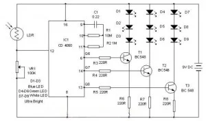 Rangkaian LED Penerang Aquarium ini menggunakan LDR sebagai sensor cahaya untuk secara otomatis beralih mode. Selama siang hari LDR memiliki resistansi yang sangat rendah sehingga IC1 tetap stand by. Di malam hari, LDR menawarkan ketahanan tinggi dan reset pin 12 dari IC1 menjadi rendah. Ini mengaktifkan IC1. CD4060 adalah counter biner dengan sepuluh output. Output dari IC menjadi salah satu tinggi per satu berdasarkan frekuensi penghitungan yang ditentukan oleh C1, R1 andR2.