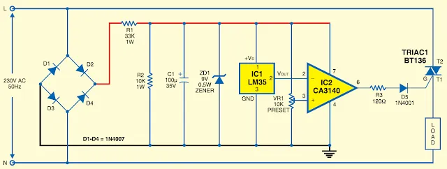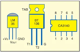 Gambar di atas menunjukkan rangkaian pengendali suhu komputer, sedangkan gambar di bawah menunjukkan konfigurasi setiap pin dari komponen yang digunakan. Rangkaian bekerja dengan tegangan suplai 9 VDC yang didapatkan dari sumber utama dengan cara berikut; Tegangan suplai disearahkan oleh empat buah dioda penyearah (bridge). Arus yang sudah disearahkan tersebut diredam tegangannya oleh R1 dan R2 dan kemudian distabilkan oleh dioda zener ZD1. Kapasitor C1 berfungsi sebagai filter untuk menghilangkan tegangan riak, sehingga tegangan yang mengalir ke sensor dan komparator akan menjadi lebih halus.