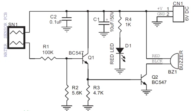 Detektor level air dibuat dari dua lempeng bahan konduktor, bisa juga kita buat dari tembaga PCB. Sehingga jika kedua lempeng tersebut tersentuh air, maka menyebabkan konduksi pada sensor tersebut. Dengan demikian tegangan 6 Volt dari baterai akan mengalir ke transistor penguat sinyal Q1. Transistor penguat akan memberikan trigger pada transistor Q2 yang merupakan switch elektronis untuk mengaktifkan buzzer.
