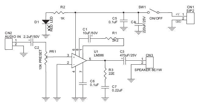 Sesuai dengan judulnya, amplifier ini cukup simpel dirangkai dan dapat diaktifkan hanya menggunakan baterai 6 - 12 volt. Komponen utama dari rangkaian ini adalah IC penguat LM386.
