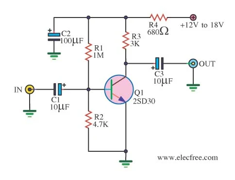 Bila Anda ingin memperkuat sinyal suara dari segala sumber sebelum ke rangkaian penguat, biasa menggunakan Pre Amplifier atau Pre-Amp. Kita dapat menggunakan rangkaian yang menarik ini karena hanya menggunakan satu buah transistor (nomor atau seri pengalihan transistor dapat menggunakan C1815 atau C945 atau C828, dll.) Rangkaian ini mudah dirangkai dan kualitasnya juga cukup bagus.