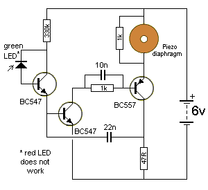 Lampu LED dalam rangkaian ini akan mendeteksi cahaya untuk mengaktifkan osilator. LED merah tidak bekerja. Tapi LED hijau, LED kuning dan LED putih Hi-bright dan LED merah Hi-bright bekerja dengan sangat baik.