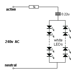Sebuah kapasitor 100n akan memberikan 7mA RMS atau puncak 10mA dalam gelombang penuh atau 3.5mA RMS (10mA puncak selama setengah siklus) dalam setengah gelombang. (ketika hanya 1 LED di setiap string).