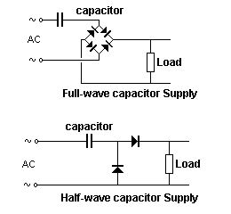 Dalam penyediaan setengah gelombang, kapasitor memberikan 3.5mA RMS (10mA puncak pada setiap setengah siklus, tapi satu setengah siklus yang hilang dalam dioda) untuk setiap 100n ke beban, dan selama setengah lainnya-siklus puncak 10mA hilang dalam dioda yang debit kapasitor.