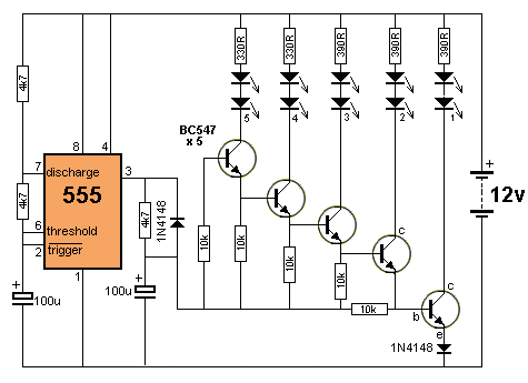 Rangkaian ini dapat digunakan untuk mengindikasikan ketika motor akan belok ke kiri atau kanan. Kita membutuhkan dua rangkaian yang sama, satu untuk lampu sign kiri dan satu untuk lampu sign kanan. Tegangan sumber 12v didapatkan dari accumulator.