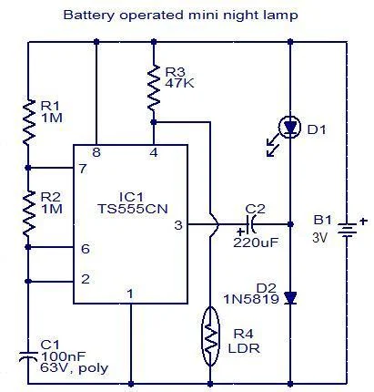 Berikut ini adalah rangkaian lampu malam dengan LED berdaya rendah yang secara otomatis padam pada saat siang hari dan menyala pada malam hari. IC timer CMOS TS555CN dirakit sebagai generator gelombang persegi yang beroperasi sekitar 5 Hz. Tegangan output dari IC1 digandakan menggunakan kombinasi kapasitor C2 dan dioda D2 untuk mengaktifkan LED. Lampu dapat menggunakan jenis bright white LED. Pada siang hari resistansi LDR turun beberapa kilo ohm dan mencegah IC agar tidak berosilasi.