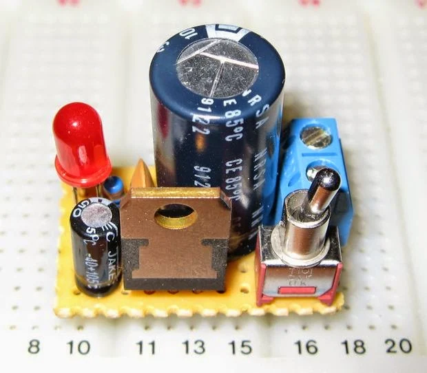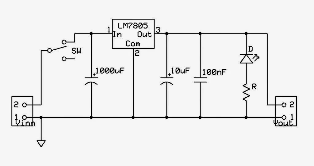 Rangkaian catu daya ini memiliki tegangan output 5 volt. Sebagai sumber tegangannya dapat dihubungkan ke baterai 12 volt atau sumber tegangan DC lain yang memiliki rentang tegangan 8 sampai 18 volt.