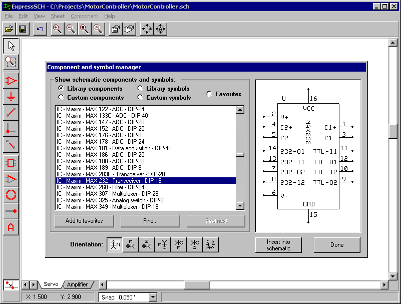 Pilih komponen yang akan digunakan melalui dialog box Component Manager. ExpressSCH memiliki banyak fitur simbol komponen mulai dari resistor, kapasitor, transistor, dioda, IC analog, digital maupun mikrokontroler hingga bermacam simbol konektor. Untuk memasukkan komponen yang kita pilih klik botton Insert into schematic.