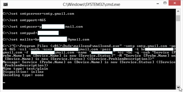 "C:\Program Files (x86)\Dude\mailsend\mailsend.cmd" "Service [Probe.Name] on [Device.Name] is now [Service.Status]" "Service [Probe.Name] on [Device.Name] is now [Service.Status] ([Service.ProblemDescription])"Silakan sesuaikan path direktori pada bagian yang berwarna kuning.